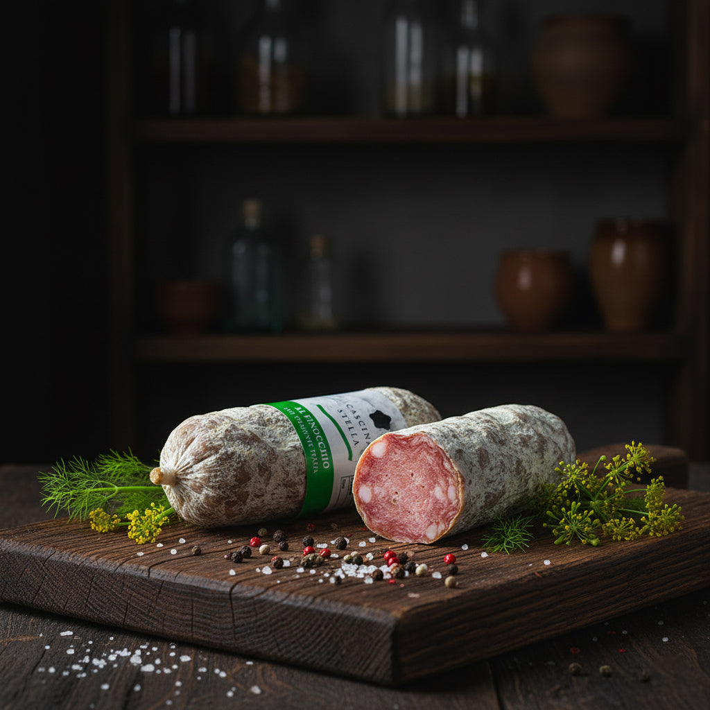 Jemně kořeněný italský salámek Al Finocchio od rodinné firmy Cascina Stella zaujme svou vyváženou chutí a aromatem čerstvého fenyklu, který dodává masu svěží a lehce nasládlý charakter. Zraje pomalu, díky čemuž si uchovává šťavnatost a výrazné aroma typické pro oblast Piemontu.