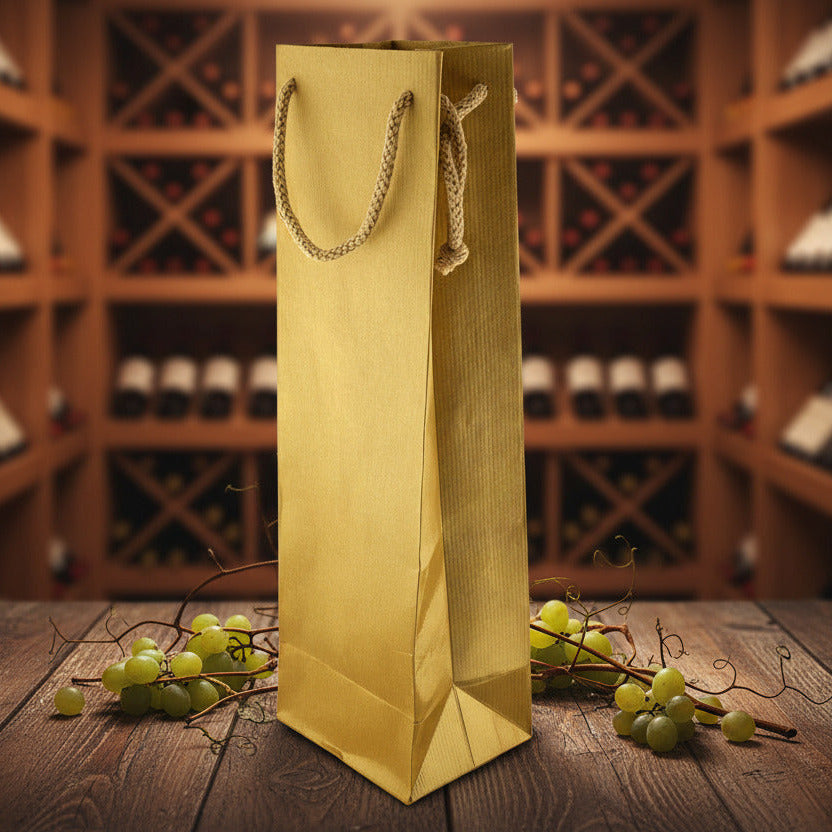 Elegantní a stylová dárková taška na víno v hnědé barvě je ideálním řešením pro darování lahve vína při jakékoliv příležitosti. Taška je vyrobena z pevného a odolného materiálu, který zajistí bezpečné přenášení lahve. Design je doplněn kvalitním poutkem, které je pohodlné do ruky a zaručuje snadné a bezpečné přenášení. Tato taška dodá vašemu daru luxusní nádech a je vhodná nejen pro víno, ale i pro další lahvové dárky. Perfektní volba pro oslavy, večírky, svatby či jako elegantní dárek pro vaše blízké.