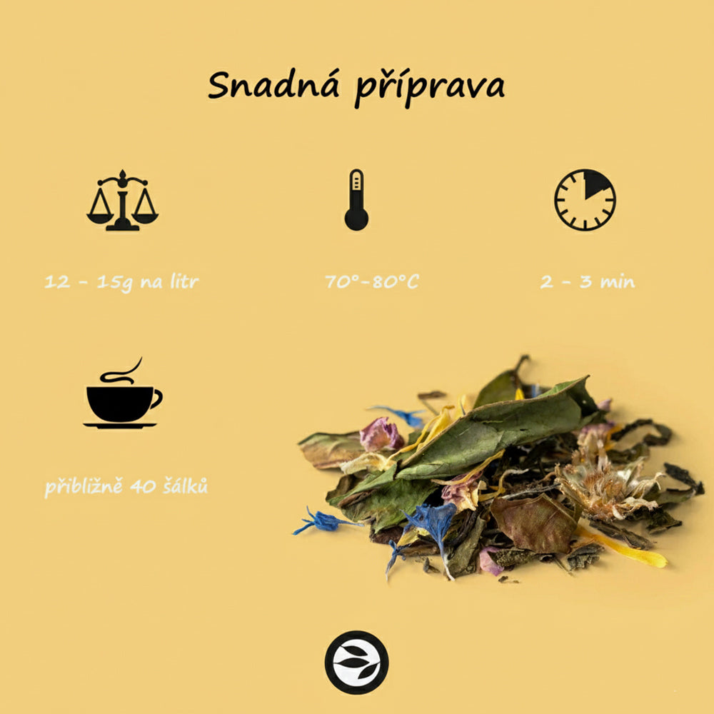 Jemná směs zeleného čaje China Sencha a bílého čaje Pai Mu Tan s přirozeným aroma bergamotu, doplněná o květy měsíčku, růže a modré chrpy. Spojení těchto prémiových ingrediencí vytváří harmonický čaj s lehkou ovocnou svěžestí a exotickým nádechem – ideální pro povzbuzení mysli i těla hned po ránu.