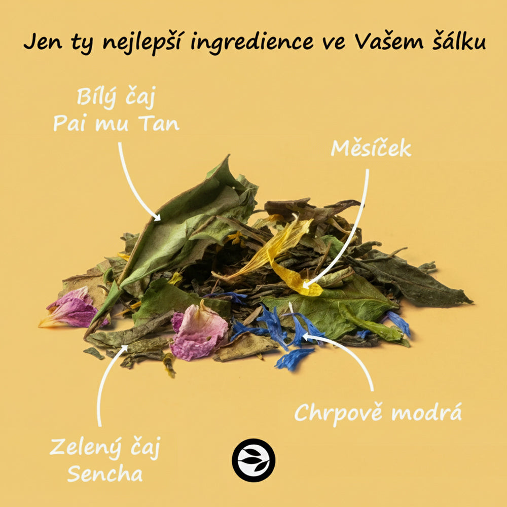 Složení: Zelený čaj China Sencha (86 %), bílý čaj Pai Mu Tan, přírodní aroma, měsíčky, okvětní lístky růží, přírodní pomerančové aroma, modré chrpy.