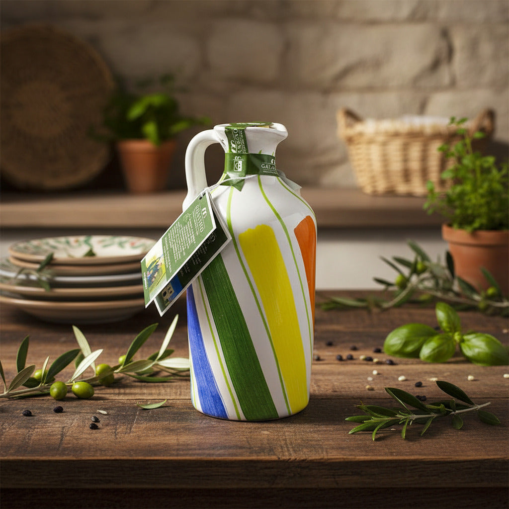 Dopřejte si kousek pravé Apulie s exkluzivním extra panenským olivovým olejem Galantino uloženým v nádherné ručně malované keramické nádobě. Tento olej pochází z oblasti Bisceglie v Puglii, regionu, který produkuje nejvíce oliv na světě a je proslulý svou špičkovou kvalitou.