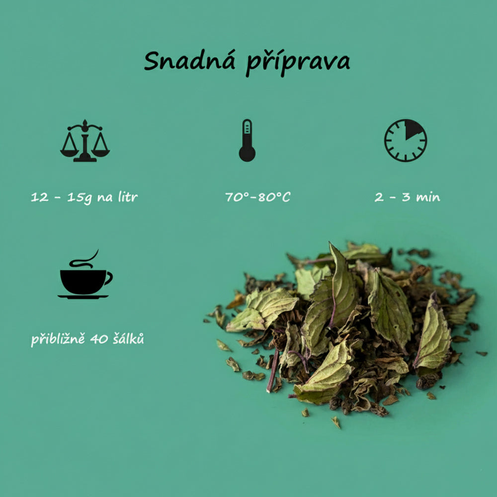 Složení: Zelený čaj China Gunpowder* (54 %), máta peprná celá*, máta klasnatá*, máta peprná*.