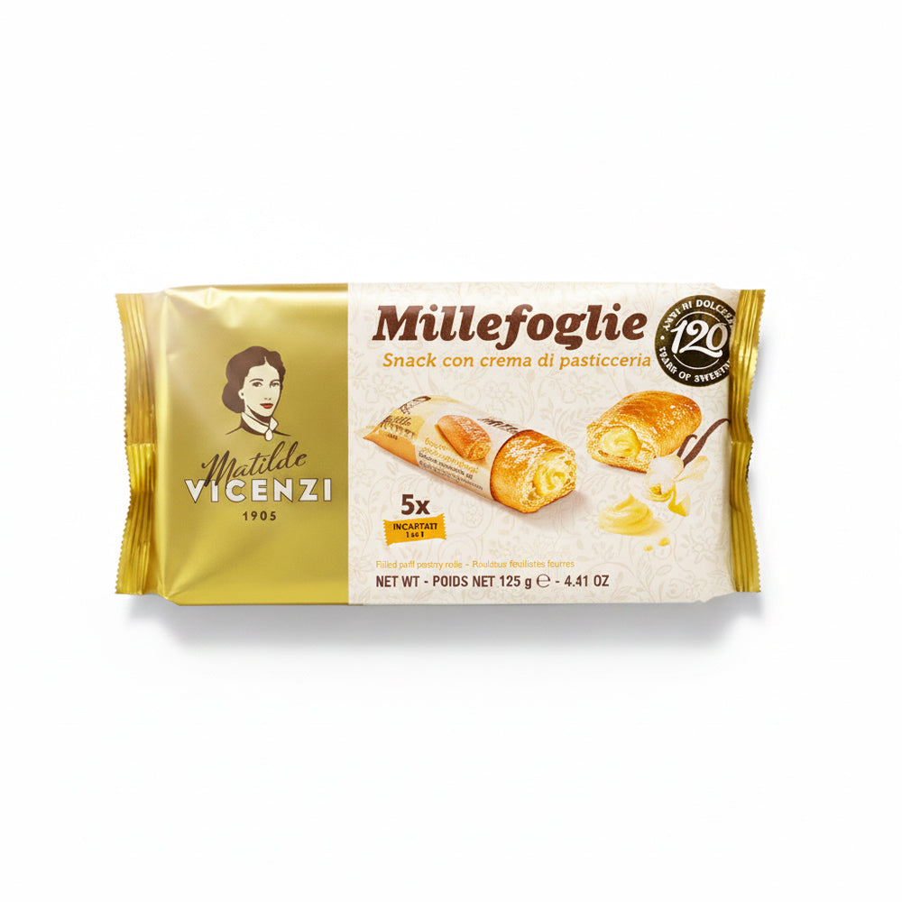 Křehké listové těsto plněné jemným vanilkovým krémem – to je Millefoglie Snack alla Vaniglia, lahodná svačinka pro každou příležitost. Pět samostatně balených porcí, ideálních na cesty, do školy, do práce nebo jen tak ke kávě.