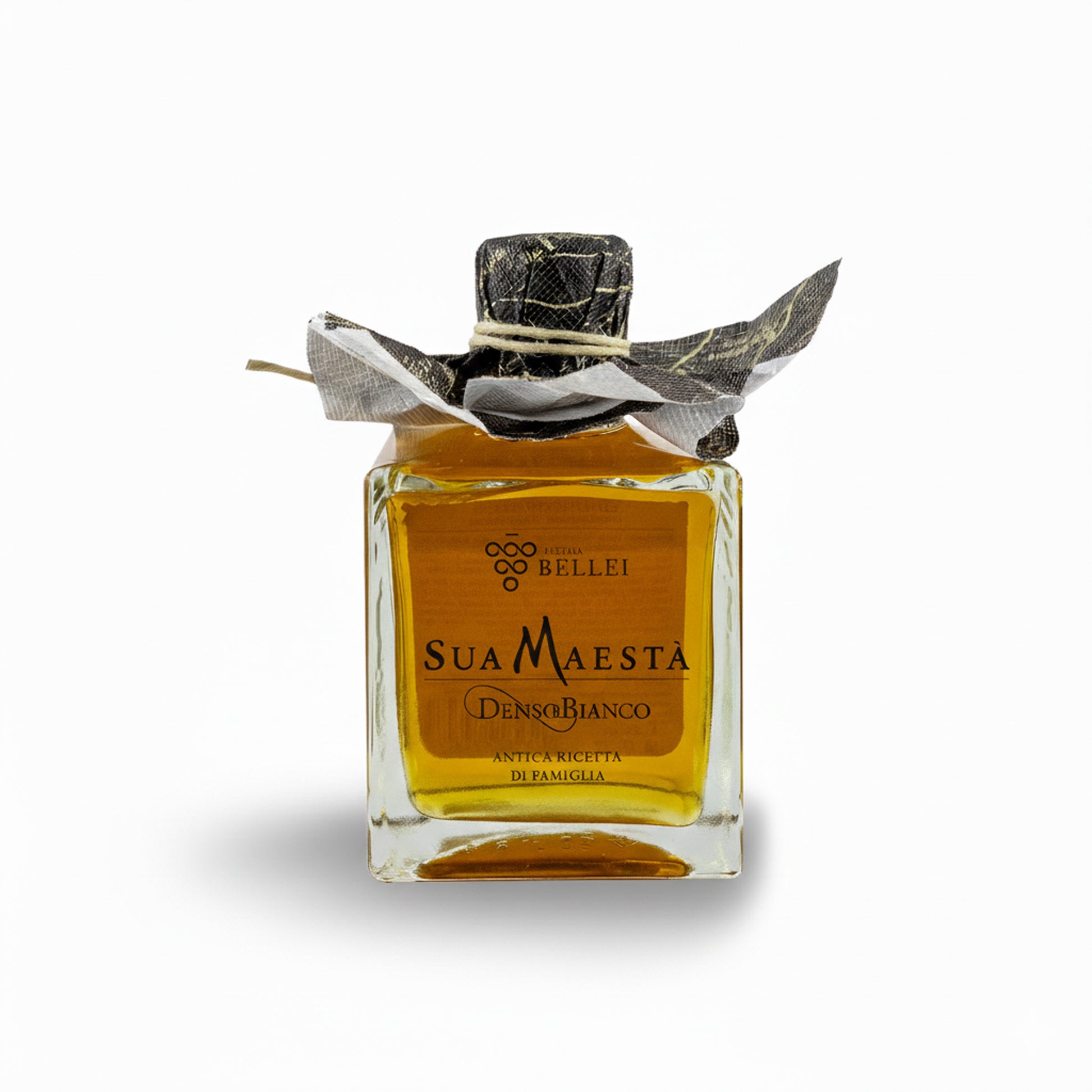 Popis výrobku: Ocet Sua Maestà Denso Bianco od Acetaia Bellei se získává spojením hroznového moštu a vinného octa. Je ovocný se sladkokyselou chutí, velmi ceněné pro svou vysokou hustotu (1,30) a nízkou kyselostí, která je nižší než 4 %. Má velmi vyvážená chuť s tóny čerstvého ovoce. Jedná se o 100% přírodní produkt získaný z vybraných surovin výhradně italského původu, bez lepku a bez přídavku siřičitanů či přísad. Elegantní ručně vyrobený šátek, který zakrývá zátku, znázorňuje mapu Modeny.