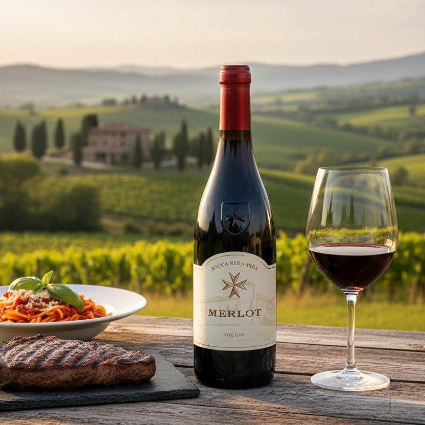Rocca Bernarda Merlot je suché červené víno pocházející z regionu Friuli-Venezia Giulia, kde se odrůdě Merlot dlouhodobě daří díky mírnému klimatu a rozmanitým půdám. Ve sklenici má sytější rubínově červenou barvu. Vůně je čistá a příjemně ovocná, s tóny zralých třešní, švestek a jemného koření. Chuť je suchá, středně plná a harmonická, s hebkými tříslovinami, vyváženou kyselinkou a hladkým, ovocným závěrem.