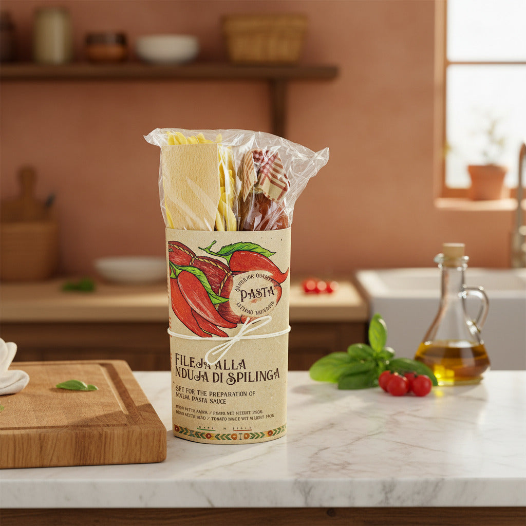 Tato delikátní sada spojuje tradiční italské těstoviny s autentickou rajčatovou omáčkou obohacenou o nduju — slavnou pikantní vepřovou specialitu z regionu Kalábrie. Omáčka s ndujou spojuje bohatou chuť rajčat s výrazným kouřovým a pikantním charakterem ndujy, čímž vzniká plnohodnotná a intenzivní chuťová základna pro pravou italskou večeři. Tento set je navržen jako kompletní balení pro milovníky autentické středomořské kuchyně — ideální pro rychlé a aromatické jídlo doma. Obsahuje dřevěnou vařečku.