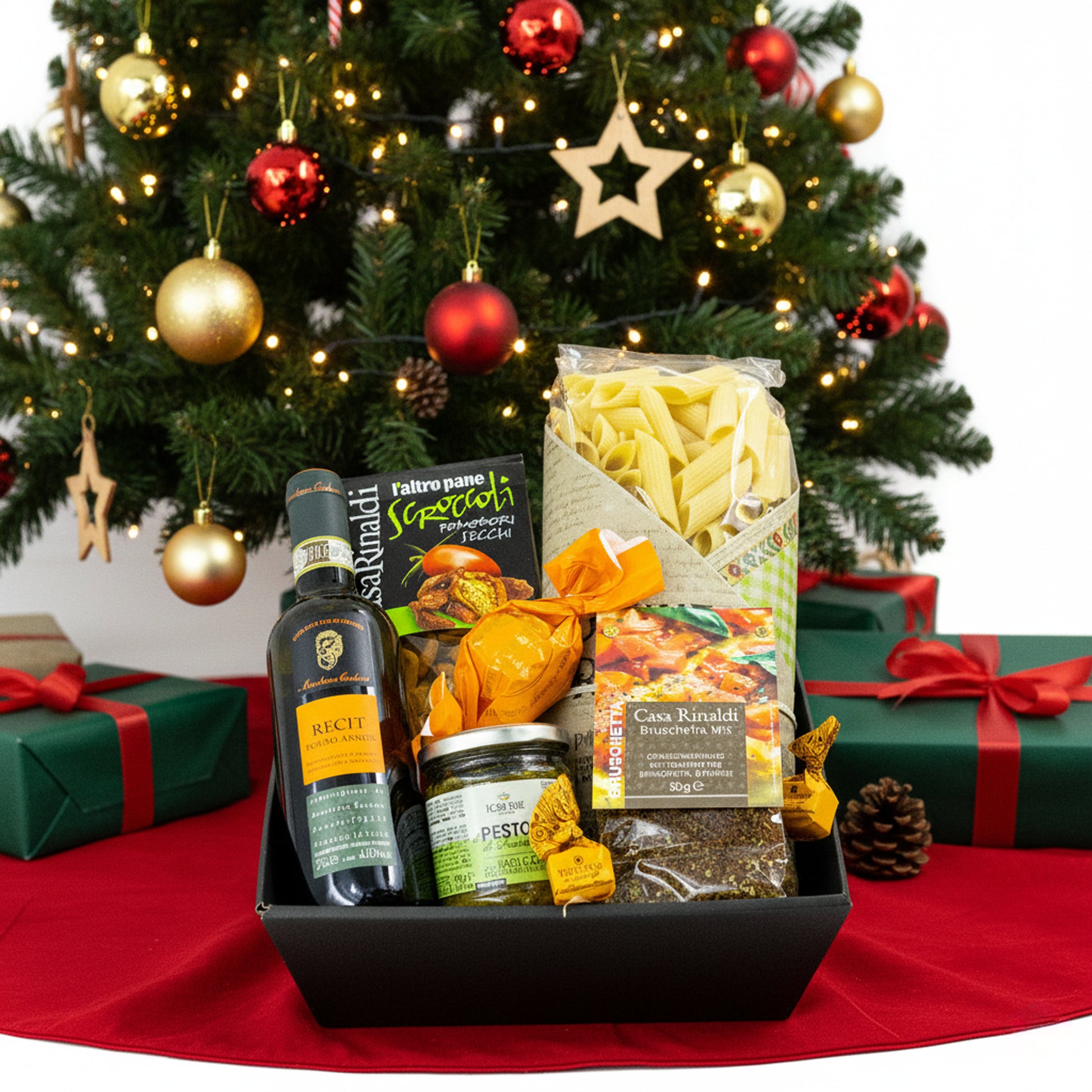 Elegantní dárkový koš v černém provedení plný autentických chutí Itálie. Kombinace aromatického bazalkového pesta, kvalitních těstovin a bílého vína Recit od Monchiero Carbone vytváří dokonalý gurmánský zážitek. Vše je pečlivě zabaleno do celofánu s vánoční mašlí – připraveno k obdarování. Rozesíláme během prosince a garantujeme doručení do vánoc!